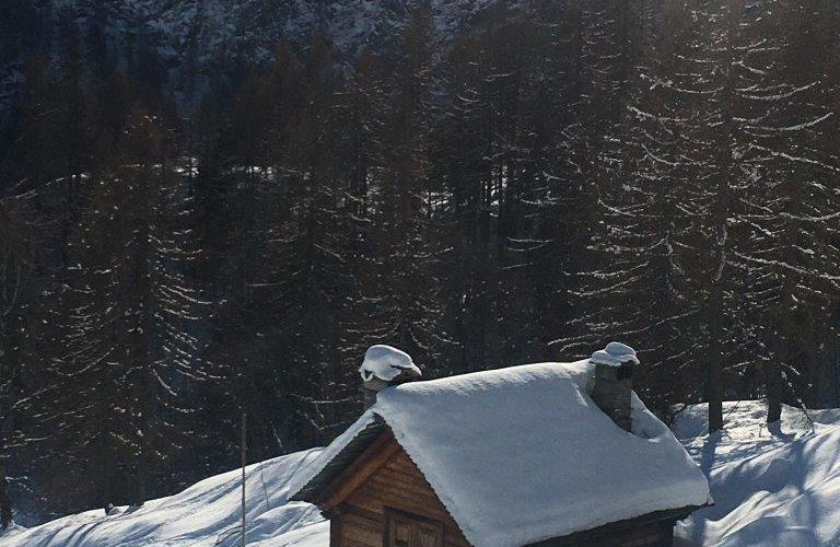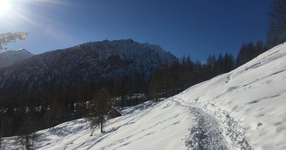 Vom Zentrum des Dörfchen hat man dann verschiedene Möglichkeiten mit der Schneeschuhwanderung zu starten. Ein Weg führt den verschneiten Hang hinauf Richtung "Rifugio La Reggia". Es gibt einige flache Streckenabschnitte, die zu einer Pause einladen. Die Baumkronen umrahmen den herrlichen Blick auf das Dorf, in dem die Zeit stehen geblieben scheint.